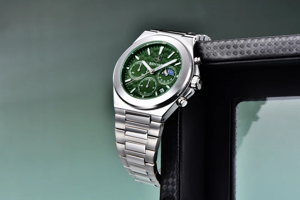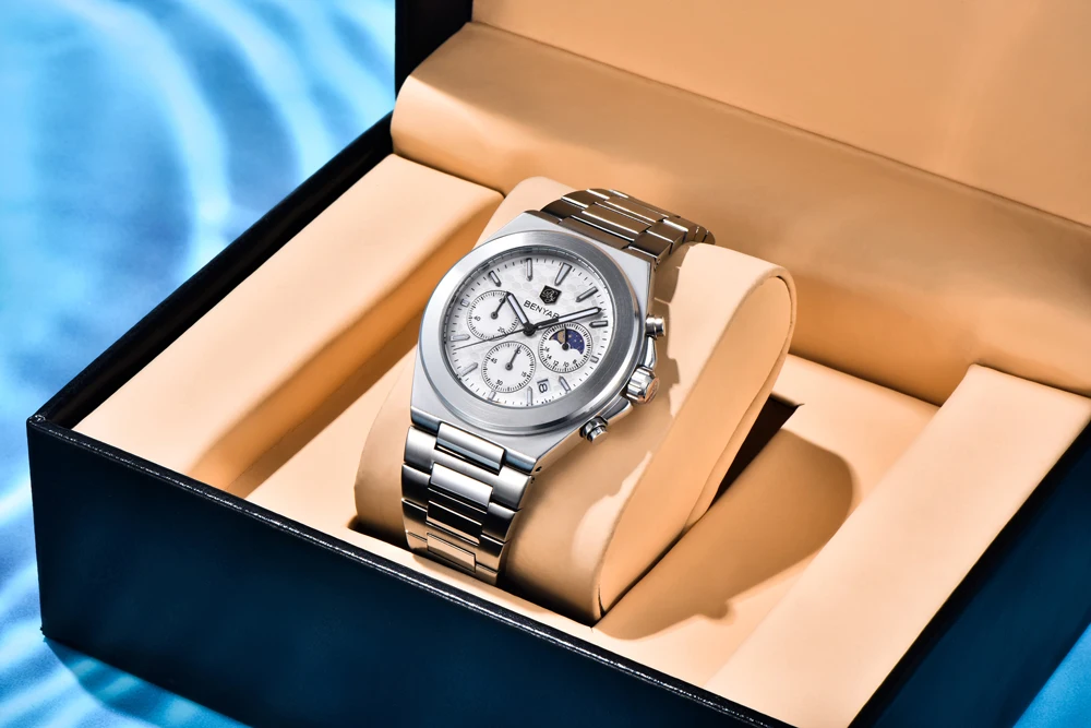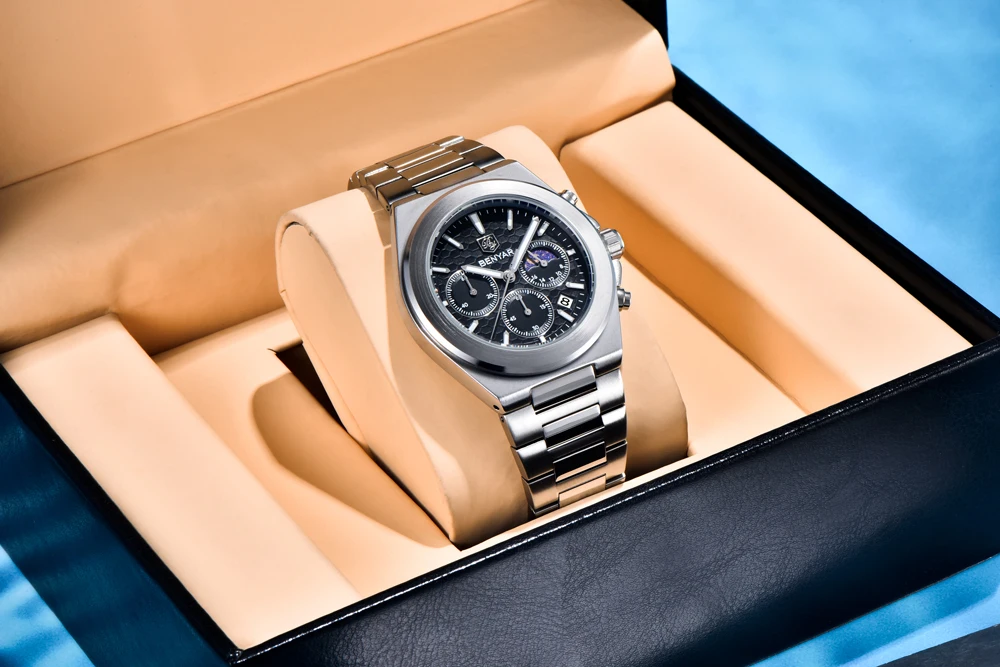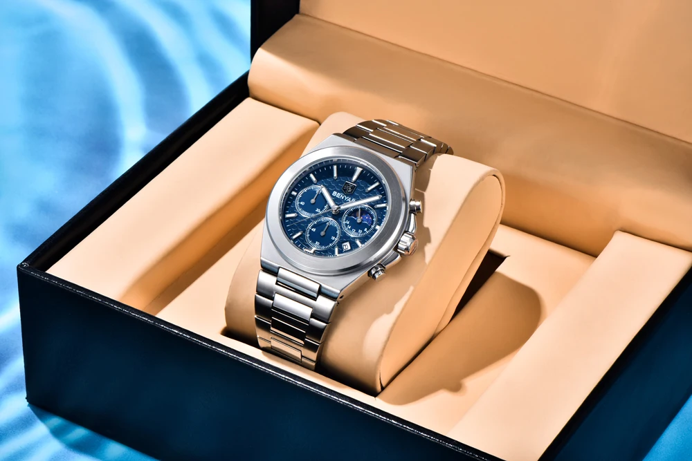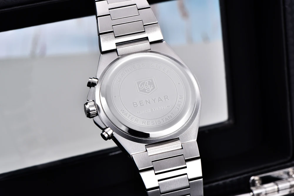 The BENYAR BY-5220 is the luxury quartz chronograph that redefines style. Featuring a precise Japanese movement, this watch stands out with its robust round alloy case (10.5 mm thick) and elegant stainless steel bracelet with a safety clasp. Its dial, protected by Hardlex crystal, and water resistance to 5 bar ensure durability and a commanding presence. Battery included. The perfect combination of premium functionality and striking design.