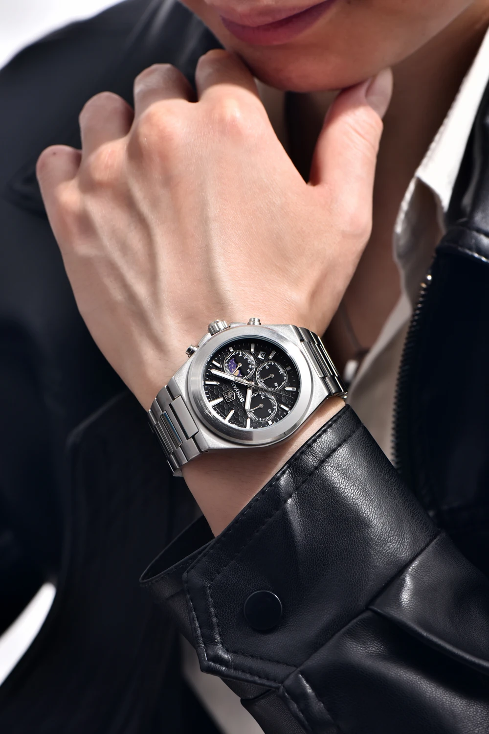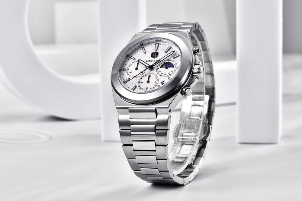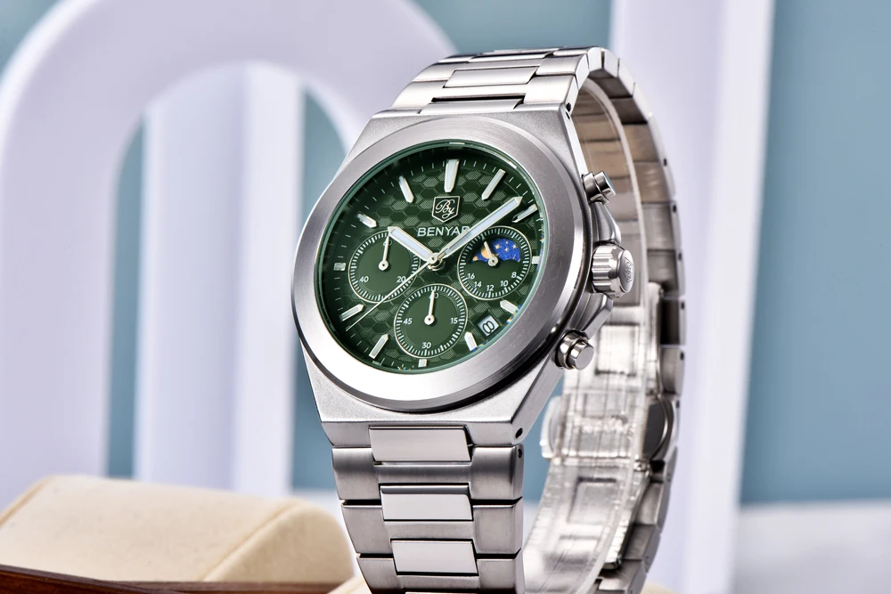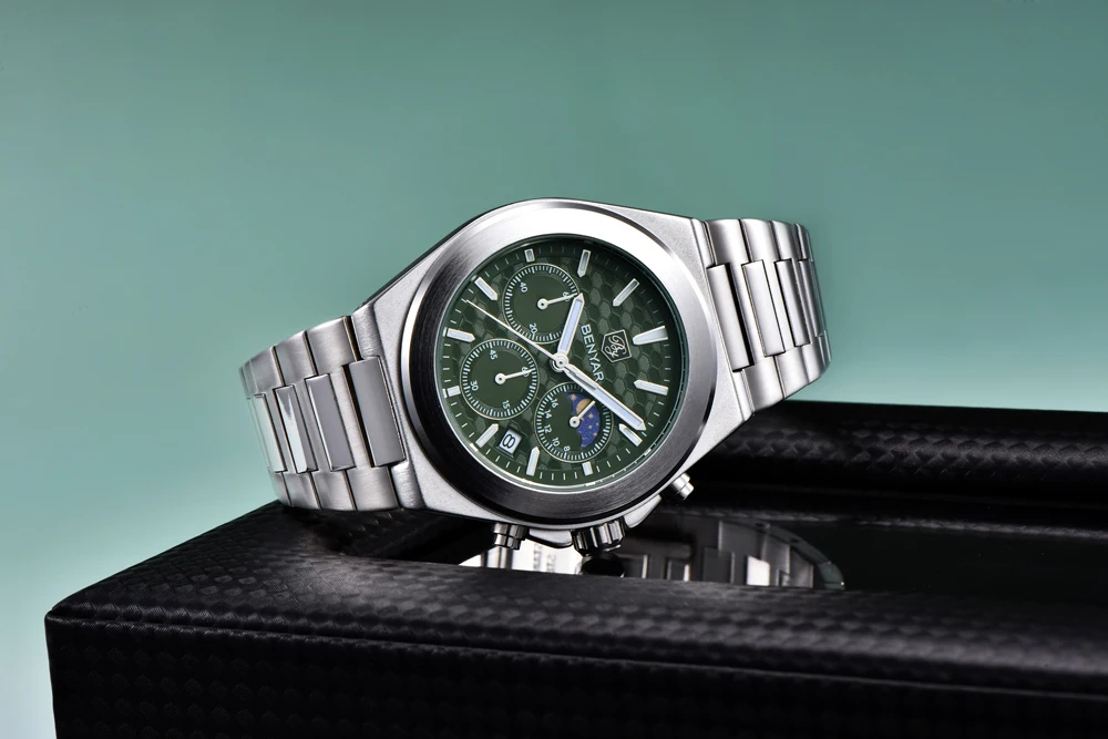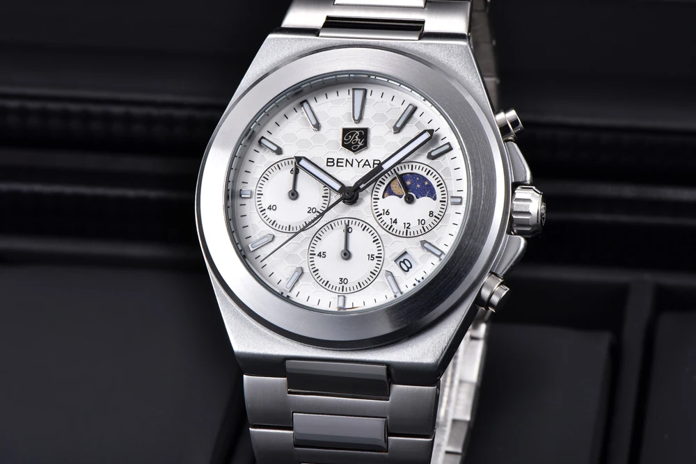 The BENYAR BY-5220 is the luxury quartz chronograph that redefines style. Featuring a precise Japanese movement, this watch stands out with its robust round alloy case (10.5 mm thick) and elegant stainless steel bracelet with a safety clasp. Its dial, protected by Hardlex crystal, and water resistance to 5 bar ensure durability and a commanding presence. Battery included. The perfect combination of premium functionality and striking design.