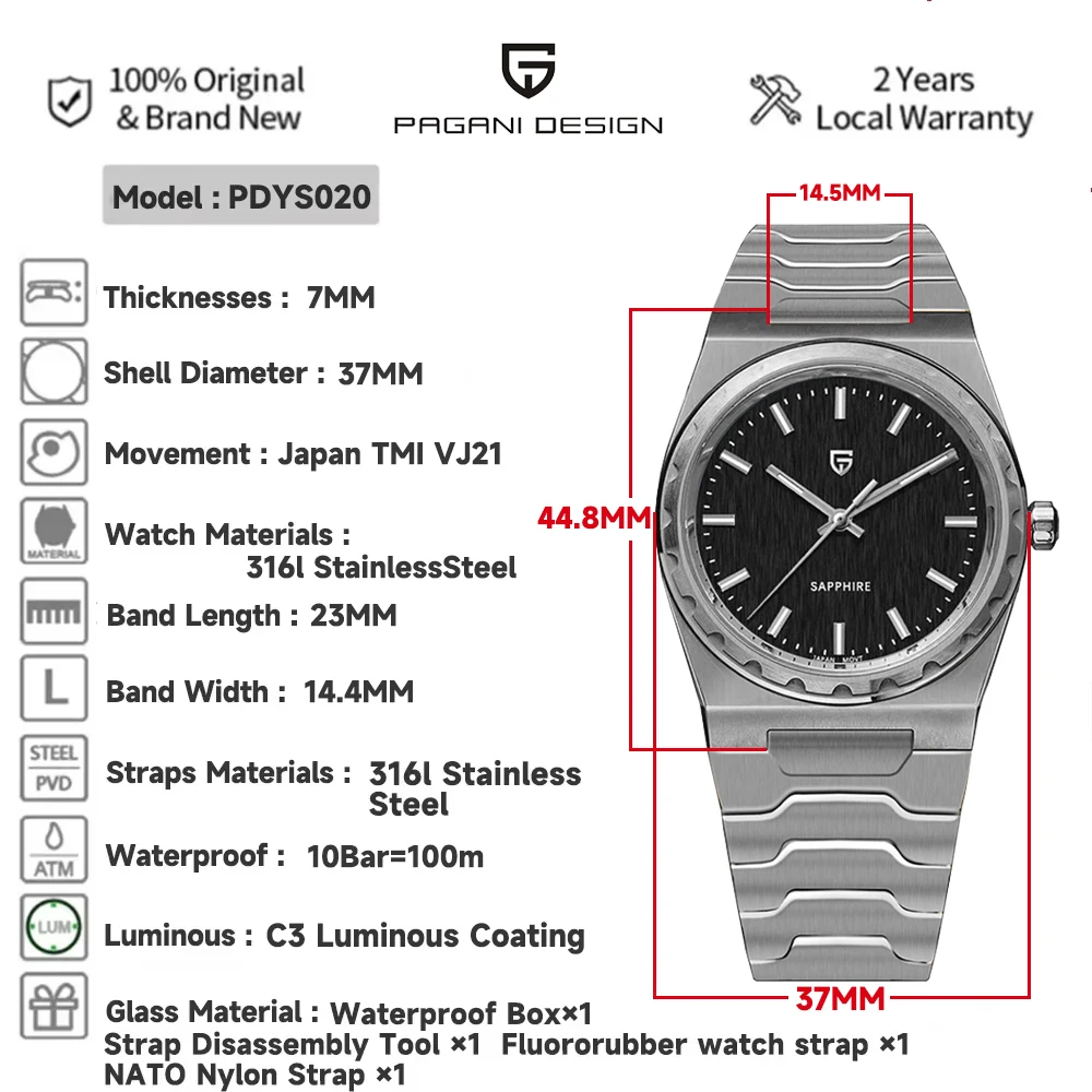 The Pagani Design PD-YS020 is the watch that will transform your style! With its ultra-precise Japanese quartz movement, it will never let you down. Admire its slim and elegant design, with a dial protected by a scratch-resistant sapphire crystal. Its robust stainless steel case and bracelet with hidden clasp ensure durability and a perfect fit. And with 100 meters of water resistance, it's as versatile as you are! This watch isn't just an accessory; it's a statement of sophistication and confidence that will accompany you in every important moment.